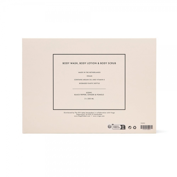 Zestaw kosmetyków 3 el., w komplecie: żel do mycia ciała 200 ml, balsam do ciała 200 ml oraz peeling do ciała 200 ml, ciepły aromat czarnego pieprzy, imbiru i pomelo, w eleganckim pudełku upominkowym