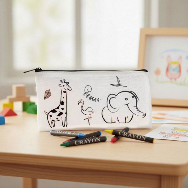 Piórnik zaprojektowany do kolorowania, posiada 5 kredek świecowych w różnych kolorach w komplecie, produkt wykonany z materiału non-woven