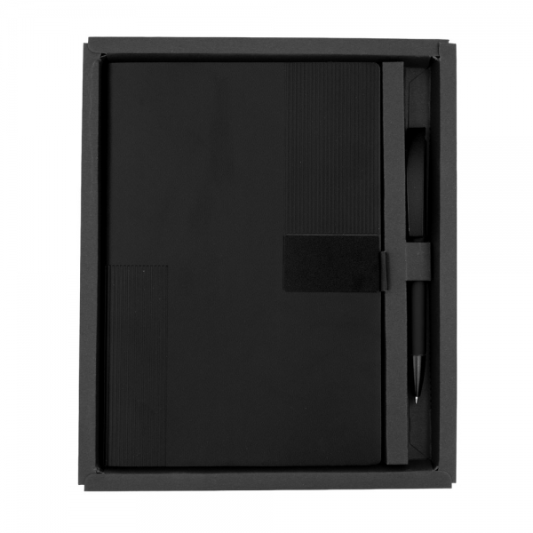 Notatnik w formacie ok. A5 posiada 80 kartek w linie (70 g/m²), tasiemka zakładkowa umożliwia wygodne zaznaczanie ostatniej strony lub ważniejszych notatek, w komplecie długopis typu "twist" z szerokim aluminiowym klipem przeznaczonym do grawerowania, przy szlufce na długopis znajduje się metalowa plakietka do grawerowania, twarda okładka wykonana z PU