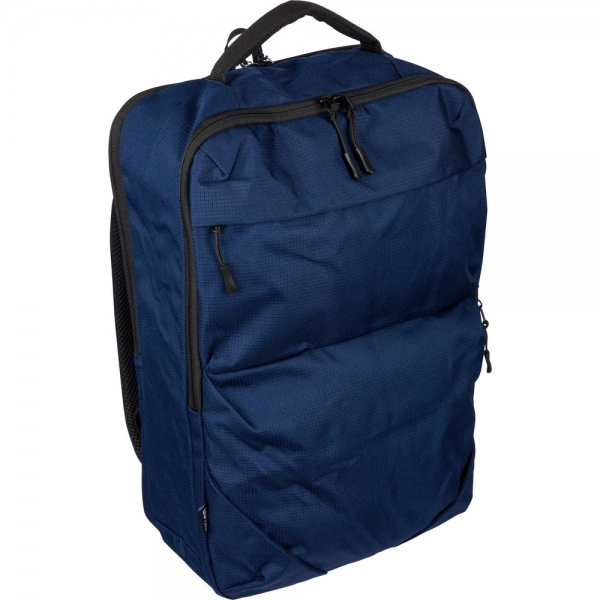 Plecak na laptopa 15" o pojemności 20 litrów, kieszeń główna zapinana na zamek, przegroda na laptopa 15", dwie małe kieszenie przednie zapinane na zamek, uchwyt ułatwiający noszenie, kieszeń boczna z siatką, wentylowane paski do noszenia na ramieniu, pasek do przymocowania do walizki, ikona OBP na metce, produkt wykonany z RPET 300D