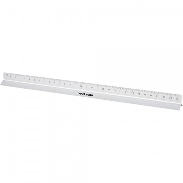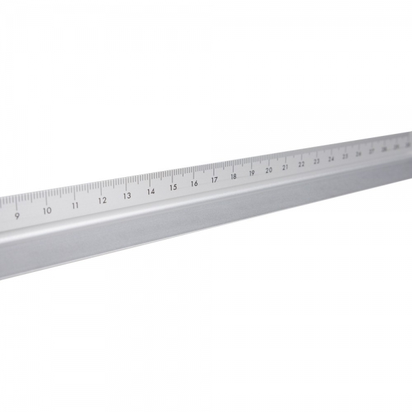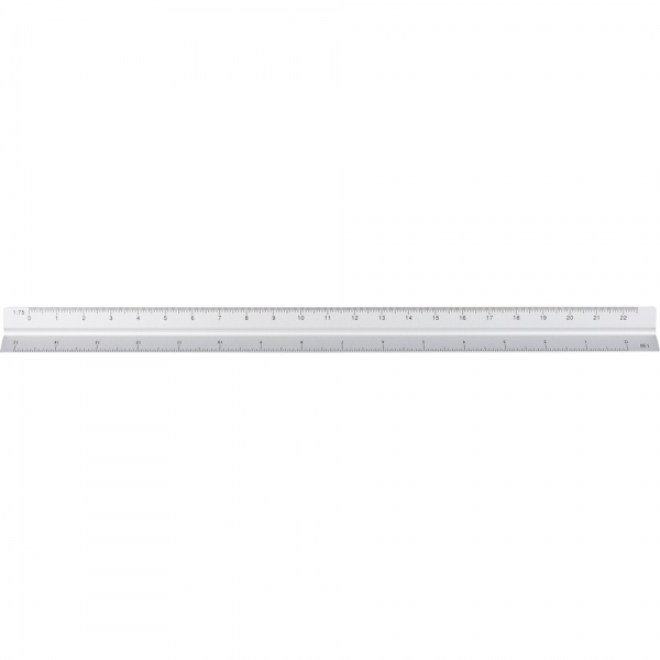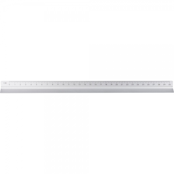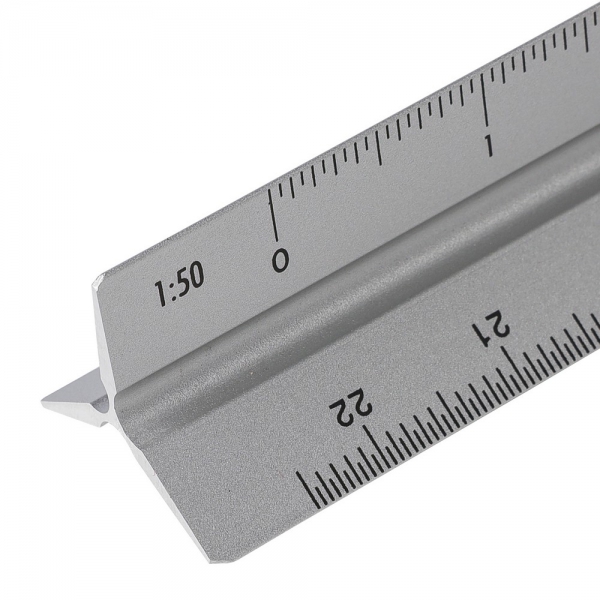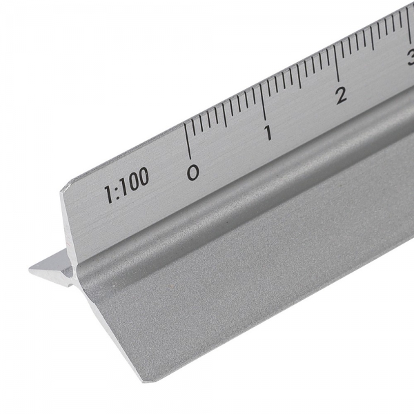 Linijka trójkątna 30 cm z różnymi skalami: 1:20, 1:25, 1:50, 1:75 , 1:100, pakowana pojedynczo w brązowe kartonowe pudełko z ilustracją, produkt wykonany z aluminium