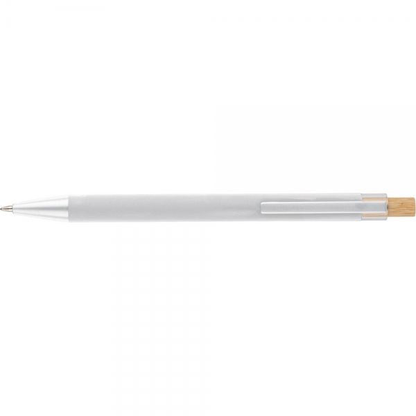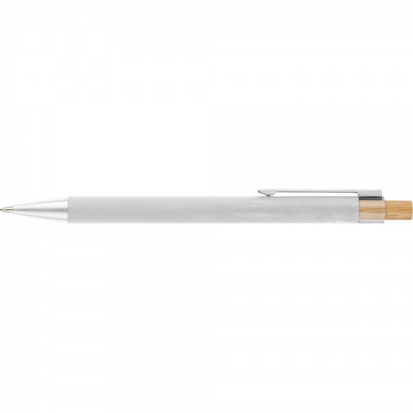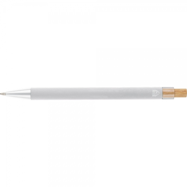 Długopis, bambusowy przycisk, metalowy klips, wkład w niebieskim kolorze, ikona recyklingu na produkcie, wystarcza na ok. 800 m pisania, produkt wykonany z ABS z recyklingu, aluminium i bambusa
