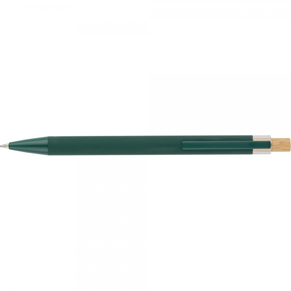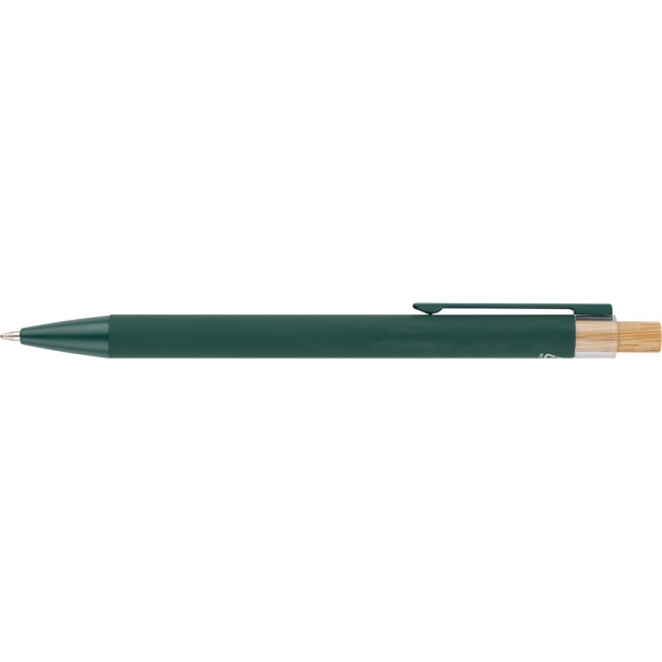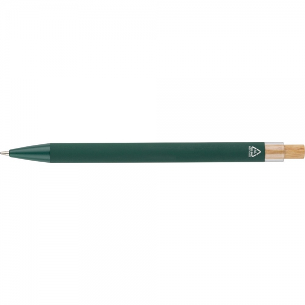 Długopis, bambusowy przycisk, metalowy klips, wkład w niebieskim kolorze, ikona recyklingu na produkcie, wystarcza na ok. 800 m pisania, produkt wykonany z ABS z recyklingu, aluminium i bambusa