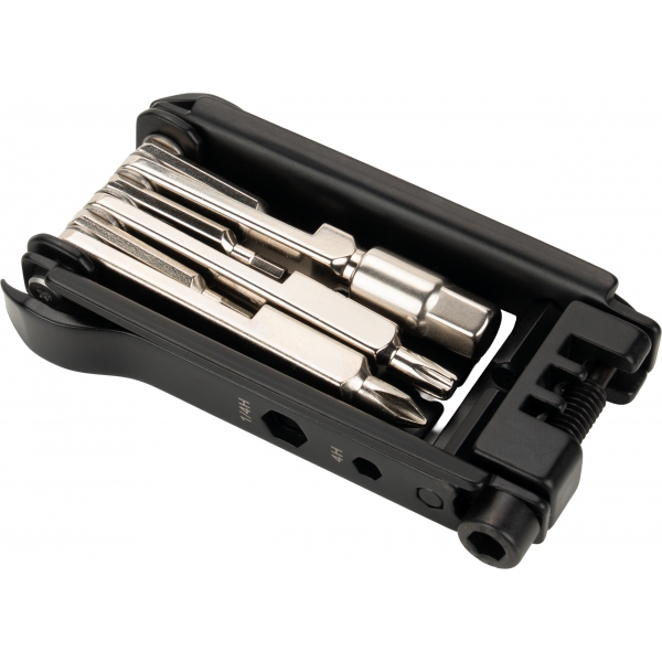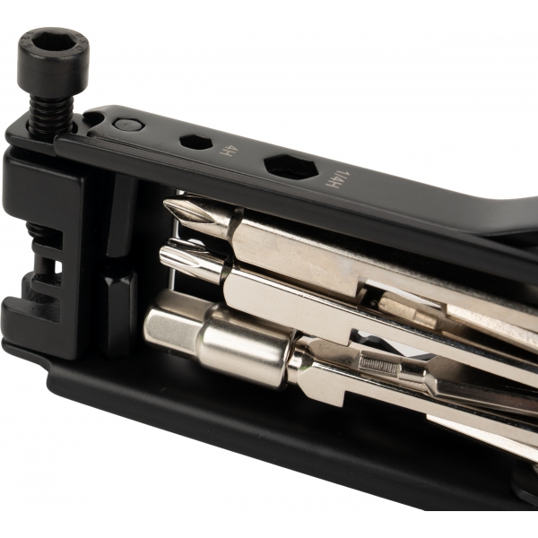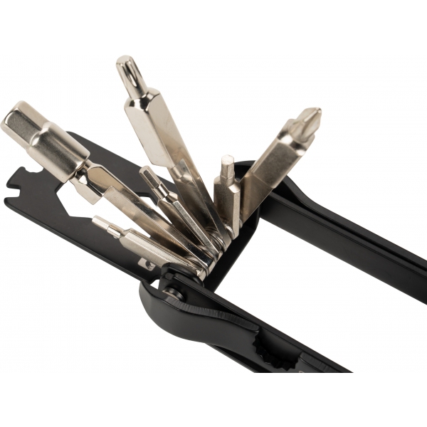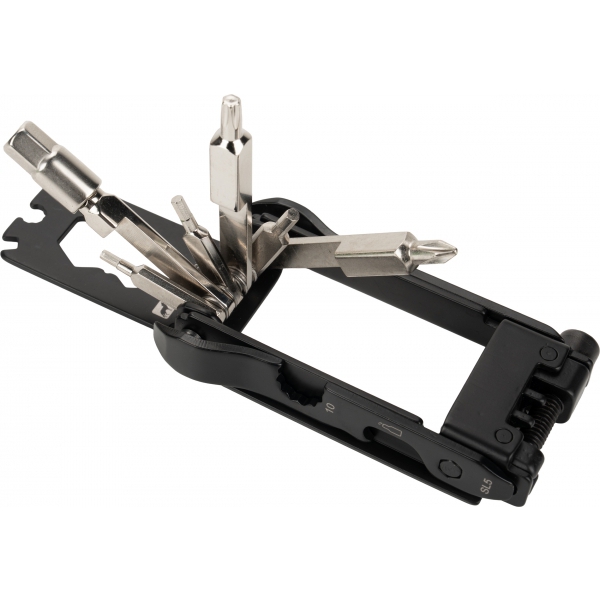 Wielofunkcyjne narzędzie dla rowerzystów. Zawiera 22 narzędzia: śrubokręt torx (3 rozmiary), otwieracz do butelek, śrubokręt płaski, śrubokręt krzyżakowy, 2 łyżki do opon, młotek do łańcuszka, klucz imbusowy (2 rozmiary), narzędzie do szprych (2 rozmiary), 2 linijki, klucz imbusowy (7 rozmiarów).