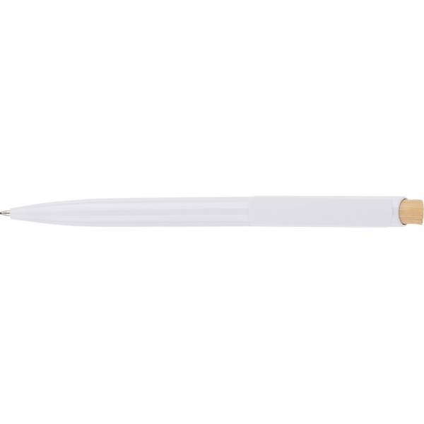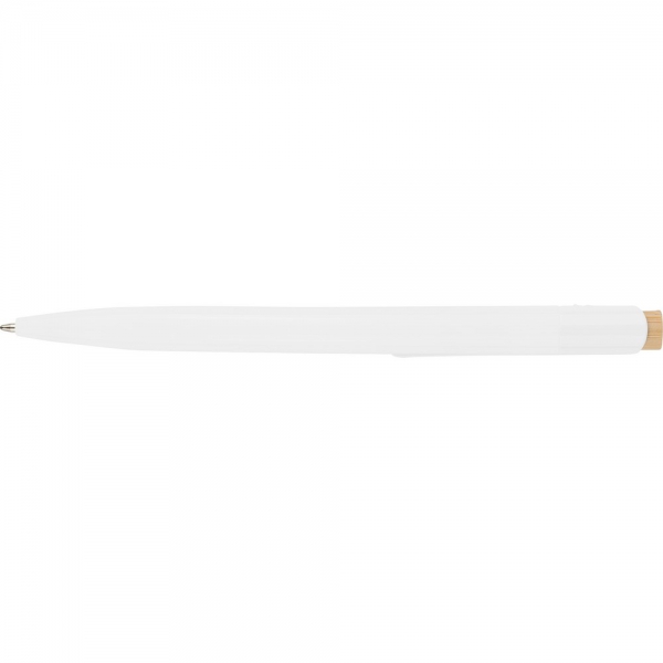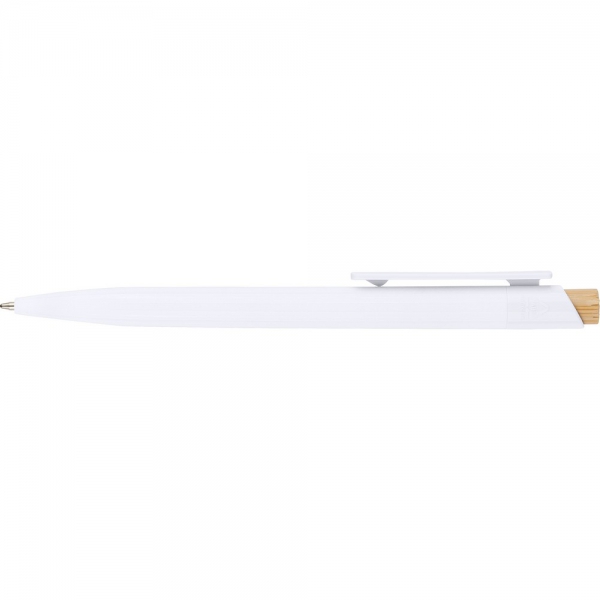 Długopis, bambusowy przycisk, metalowy klips, wkład w niebieskim kolorze, ikona recyklingu na produkcie, wystarcza na ok. 600 m pisania, produkt wykonany z ABS z recyklingu, aluminium i bambusa