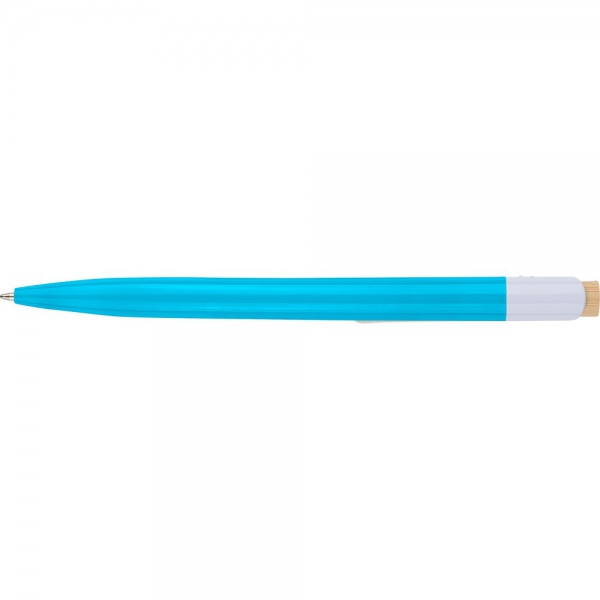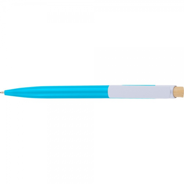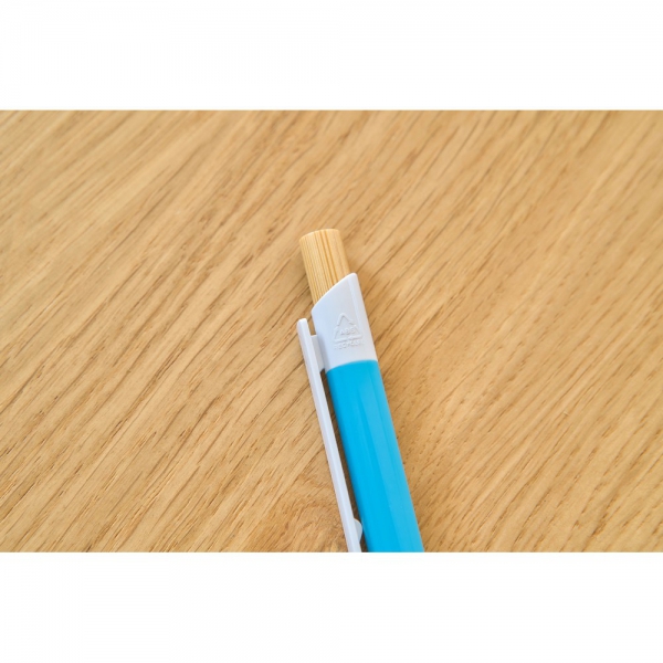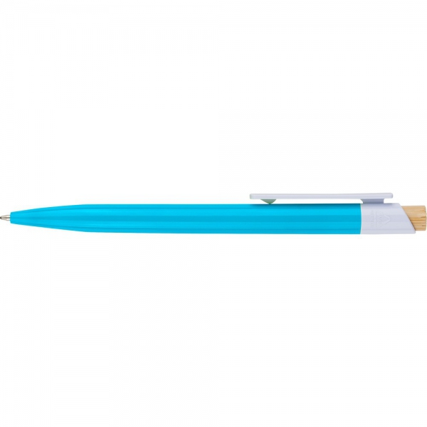 Długopis, bambusowy przycisk, metalowy klips, wkład w niebieskim kolorze, ikona recyklingu na produkcie, wystarcza na ok. 600 m pisania, produkt wykonany z ABS z recyklingu, aluminium i bambusa