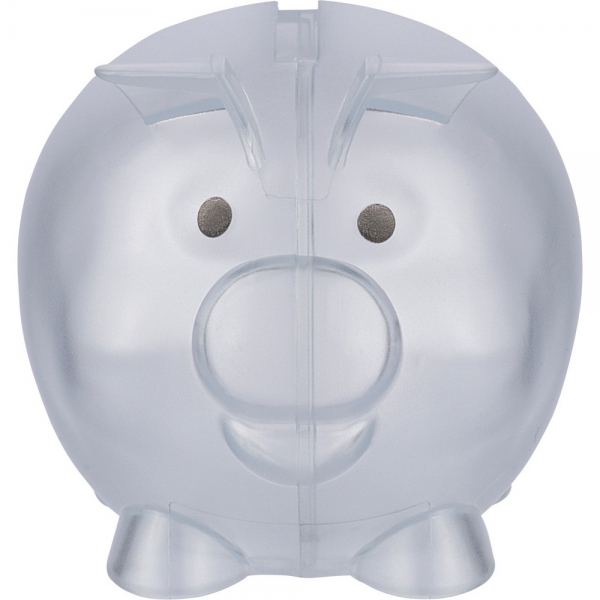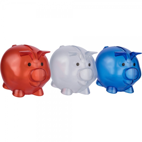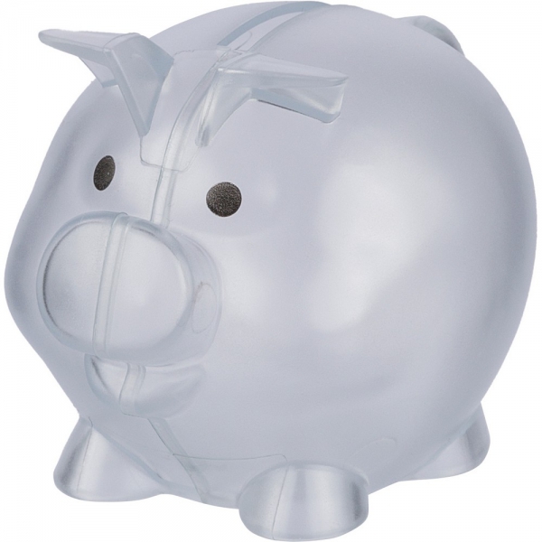 Skarbonka "świnka", ikona recyklingu na produkcie, zapakowany w woreczek foliowy z recyklingu, produkt wykonany z plastiku z recyklingu