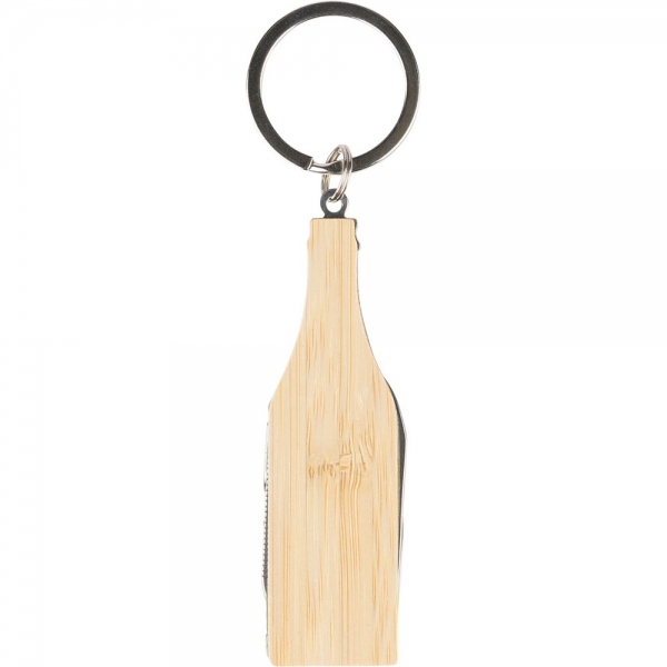 Brelok, narzędzie wielofunkcyjne zawiera: otwieracz do butelek, korkociąg pilnik do paznokci, scyzoryk, zapakowany pojedynczo w brązowy kartonik, produkt wykonany ze stali nierdzewnej 420 i bambusa