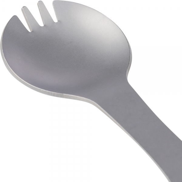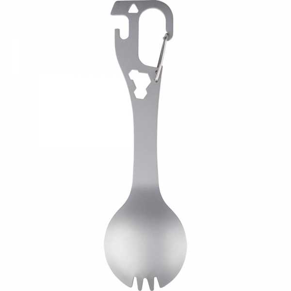 Narzędzie wielofunkcyjne zawiera: łyżkę, widelec, otwieracz do puszek i butelek, płaski śrubokręt, trzy klucze imbusowe, karabińczyk ułatwiający przypięcie, zapakowany pojedynczo w papierowe pudełko, produkt wykonany ze stali nierdzewnej 430