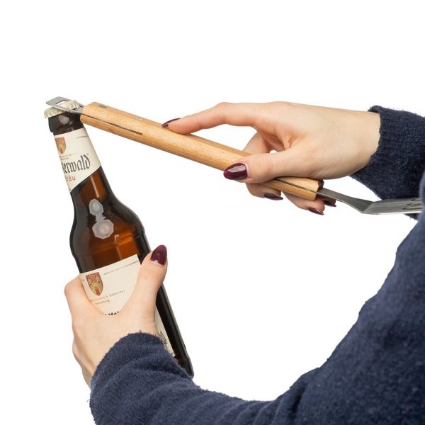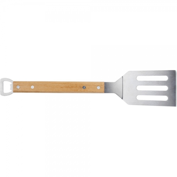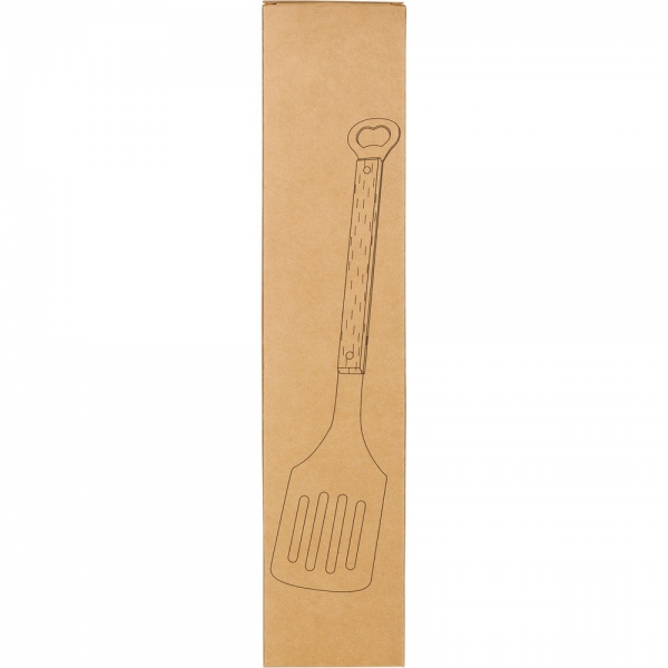 Szpatułka kuchenna z funkcją otwieracza do butelek, drewniany trzon, zapakowany pojedynczo w papierowe pudełko, produkt wykonany ze stali nierdzewnej 430/410 i drewna bukowego