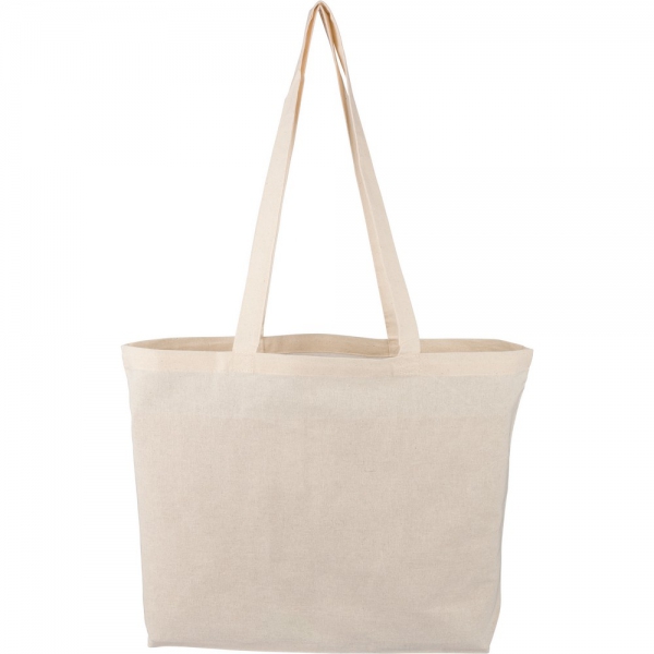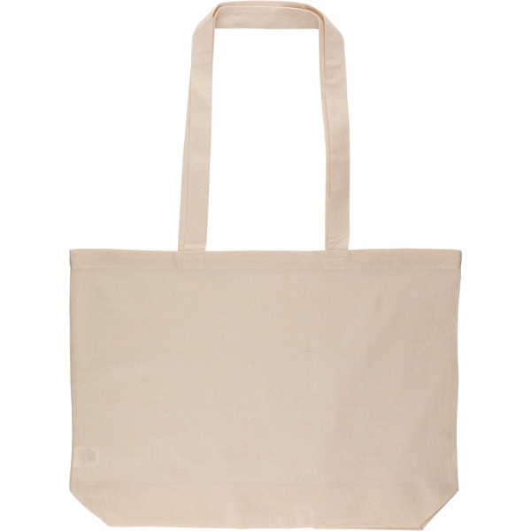 Torba na zakupy 140 g/m² o pojemności 16 litrów, posiada długie uchwyty umożliwiające noszenie na ramieniu (2,5 x 70 cm), ikona OEKO-TEX na metce, produkt wykonany z bawełny naturalnej