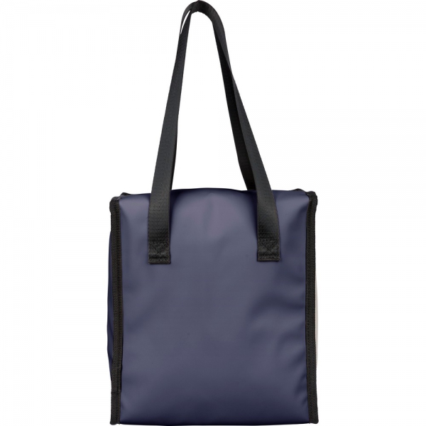 Torba termoizolacyjna o pojemności 9 litrów, posiada długie uchwyty do noszenia na ramieniu (2,5 × 66 cm), kieszeń przednia, ikona recyklingu na metce, produkt wykonany z PU z recyklingu z poliestrową podszewką