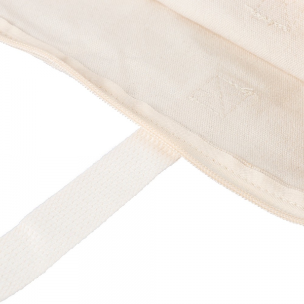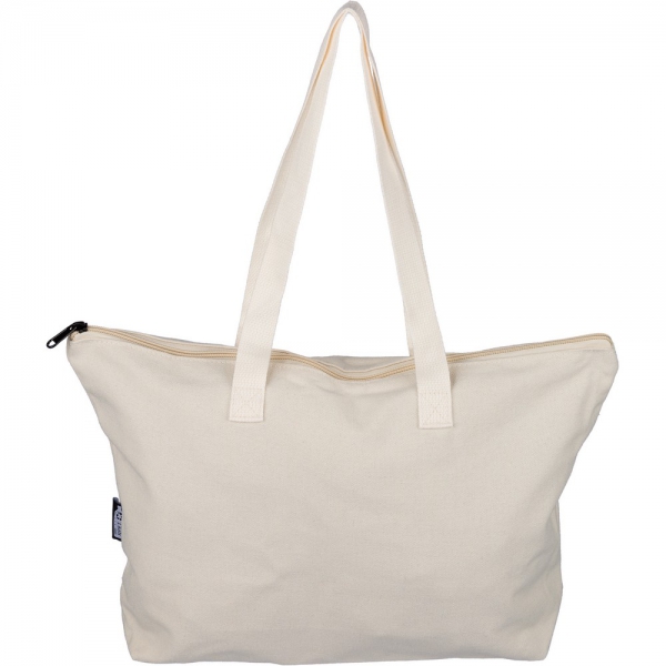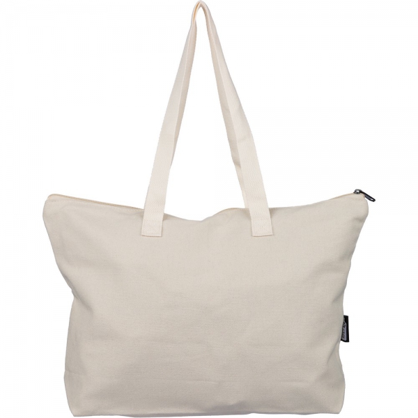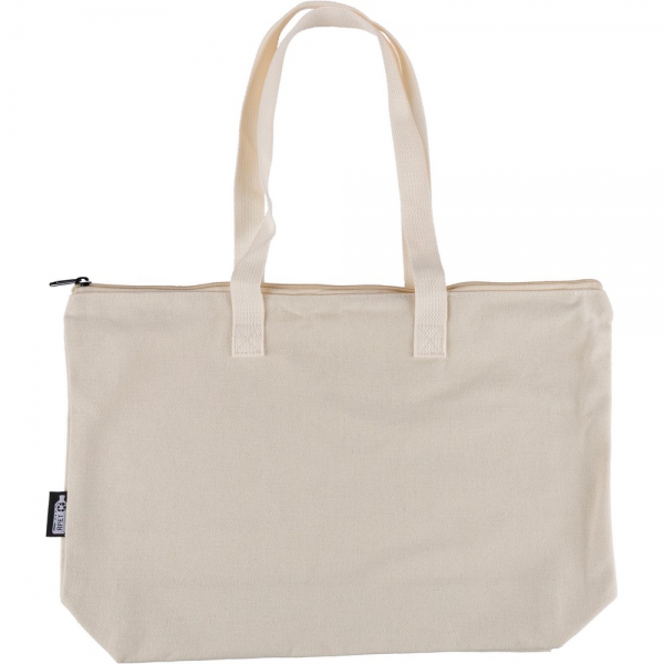 Torba na zakupy 330 g/m², duża kieszeń zapinana na zamek, posiada długie uchwyty umożliwiające noszenie na ramieniu (65 x 2,5cm), ikona RPET na metce, produkt wykonany z polibawełny z recyklingu, poliestru i RPET