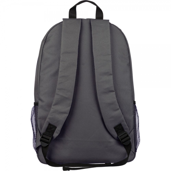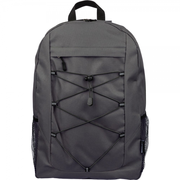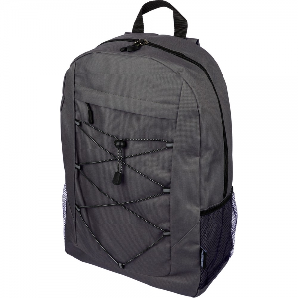 Plecak podróżny, siatkowate kieszenie po obu stronach, elastyczne sznurki z przodu do przymocowania butelki albo koca, zaciskane zamknięcie, mała kieszeń zapinana na zamek z przodu, kieszeń główna zapinana na zamek, ikona RPET na metce, produkt wykonany z RPET, poliestru i elastanu