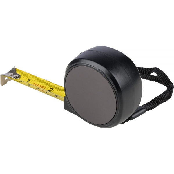 Miarka magnetyczna o długości 5 metrów, cale i centymetry, przycisk na wierzchu zwalniający blokadę, opaska na nadgarstek, zapakowana pojedynczo w brązowy kartonik, produkt wykonany z ABS, metalu i poliestru