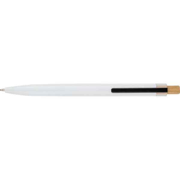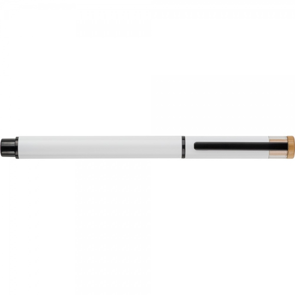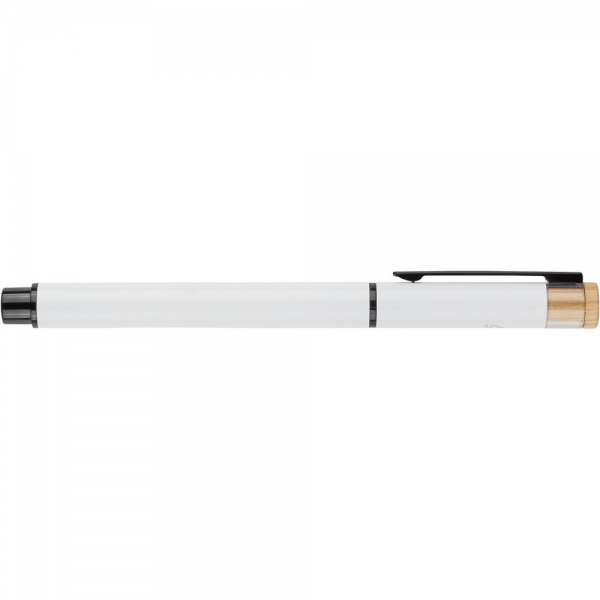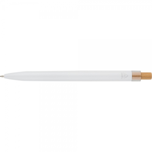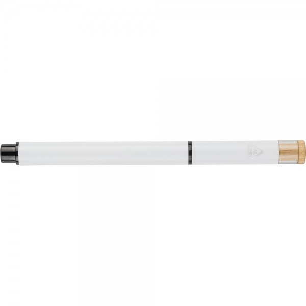 Zestaw piśmienniczy, w którego w skład wchodzi: długopis z bambusowym przyciskiem, ikoną recyklingu na produkcie, metalowym klipsem, tusz w niebieskim kolorze, wystarczający na ok. 700 m pisania, pióro kulkowe z pokrywką, metalowym klipsem, ikoną recyklingu na produkcie, wkład w niebieskim kolorze, wystarczający na ok. 500 m pisania, zapakowany w kolorowe pudełko upominkowe z recyklingu, produkt wykonany z aluminium z recyklingu, RPET i metalu