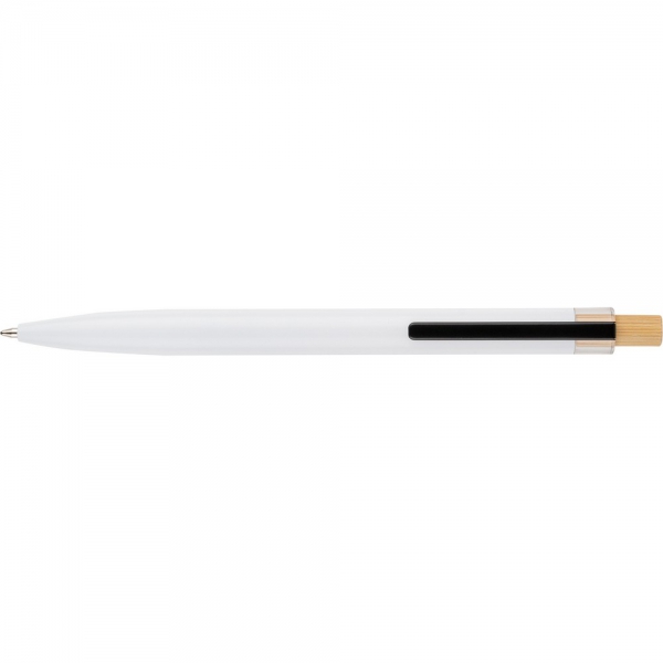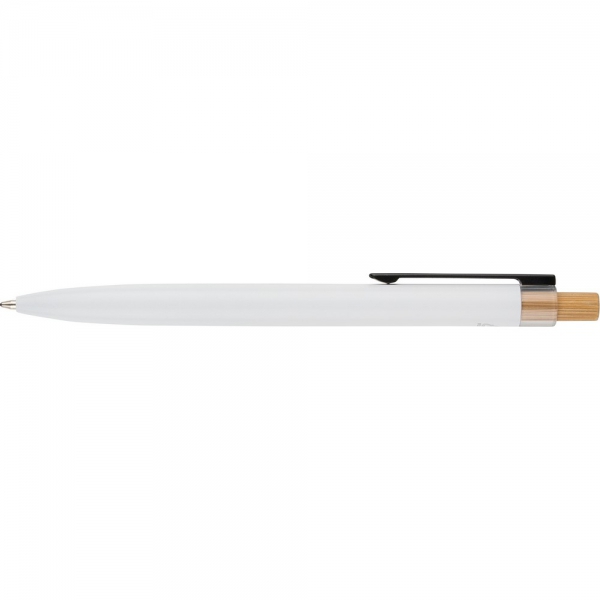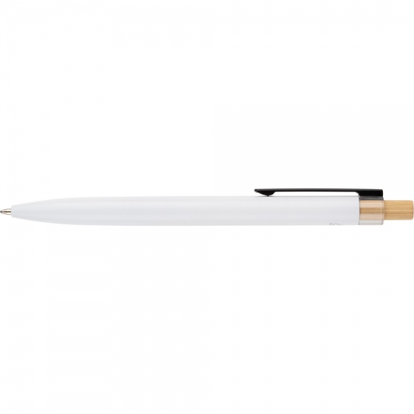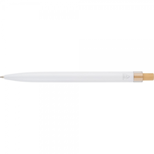 Długopis, wkład w niebieskim kolorze, wystarcza na ok. 700 m pisania, ikona recyklingu na produkcie, produkt wykonany z aluminium, RPET i z przyciskiem z bambusa