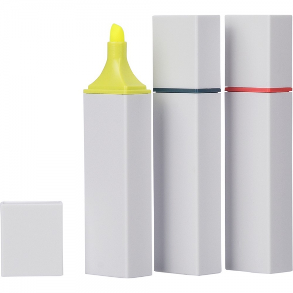 Zakreślacz, biała obudowa, kolorowy detal, zawiera ikonę ABS na produkcie, produkt wykonany z ABS z recyklingu