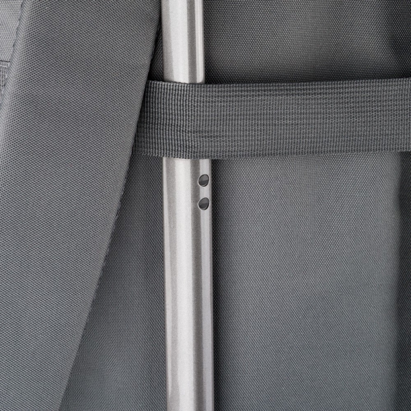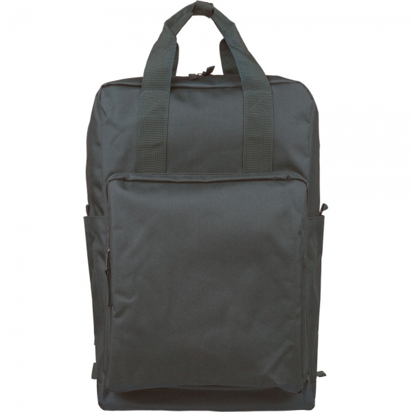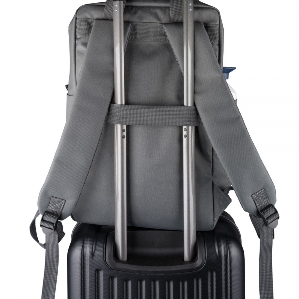 Plecak, podszewka z poliestru 210D, główna kieszeń zapinana na zamek, wewnętrzna przegroda na laptopa 16", mniejsza przednia kieszeń zapinana na zamek, regulowane i wentylowane paski do noszenia, pasek do przymocowania do walizki, kieszenie boczne po obu stronach, produkt wykonany z poliestru 600D z recyklingu