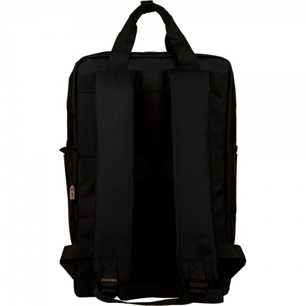 Plecak, podszewka z poliestru 210D, główna kieszeń zapinana na zamek, wewnętrzna przegroda na laptopa 16", mniejsza przednia kieszeń zapinana na zamek, regulowane i wentylowane paski do noszenia, pasek do przymocowania do walizki, kieszenie boczne po obu stronach, produkt wykonany z poliestru 600D z recyklingu