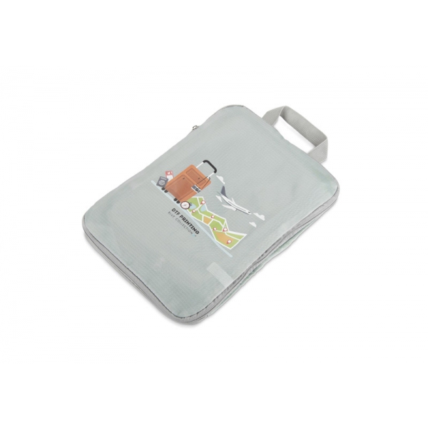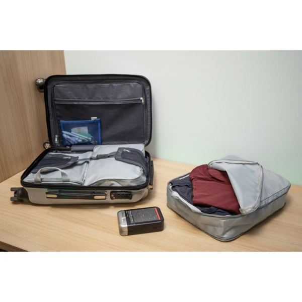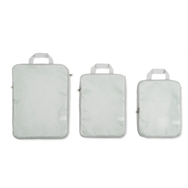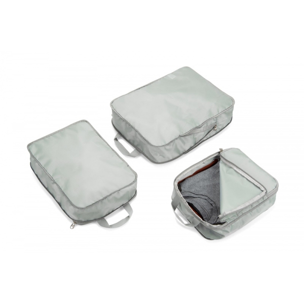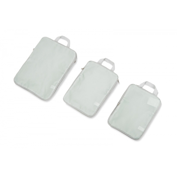 Organizer do walizki KOMPRESI to zestaw trzech kompresyjnych pokrowców podróżnych, które ułatwiają segregację ubrań i akcesoriów w walizce lub torbie. Dzięki dodatkowym suwakom umożliwiają zmniejszenie objętości zapakowanej odzieży, co pozwala lepiej wykorzystać przestrzeń bagażu. Każdy pokrowiec jest zamykany na suwak i wyposażony w uchwyt ułatwiający przenoszenie.Wymiary organizerów:I. 400 x 310 x 80 mmII. 370 x 250 x 80 mm III. 310 x 220 x 80 mm