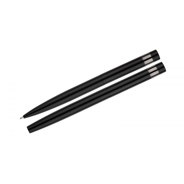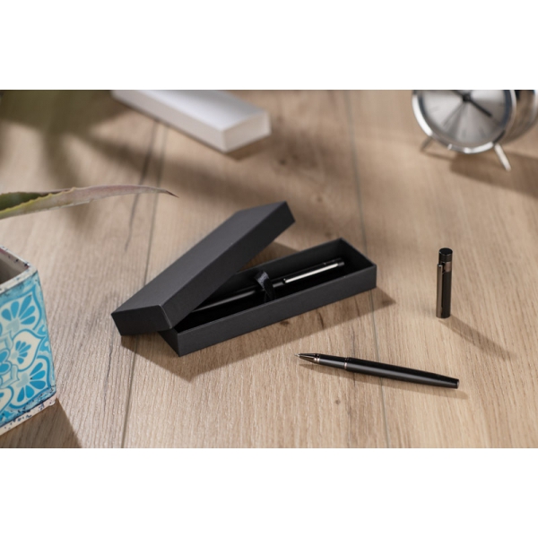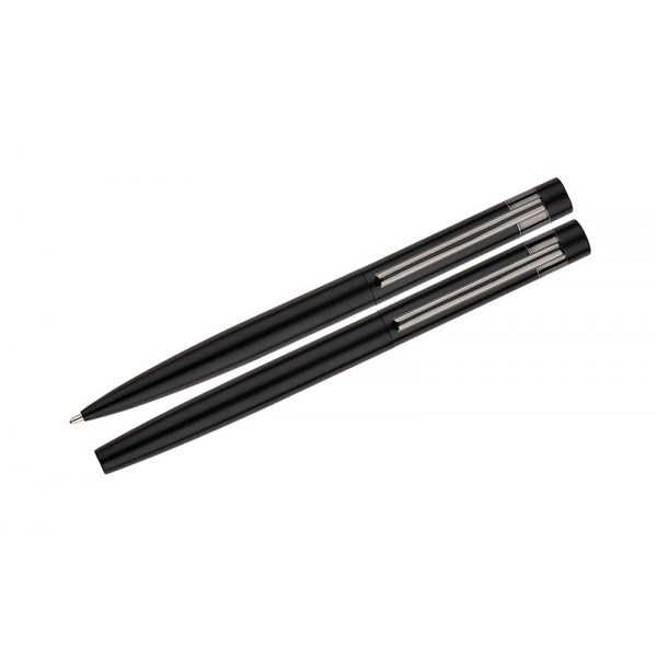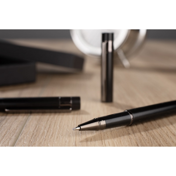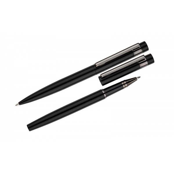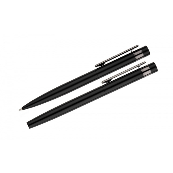 Zestaw piśmienniczy ZILE w etui zawiera metalowy długopis i pióro kulkowe o nowoczesnym wykończeniu. Całość uzupełnia elegancki, ciemnoszary klips, który nadaje zestawowi profesjonalny charakter. Doskonały wybór na biznesowy upominek.