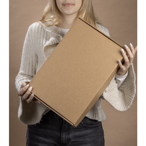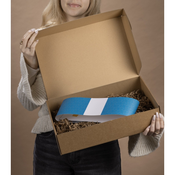 Zestaw do pakowania AZUL "L" to gotowe i estetyczne rozwiązanie do tworzenia firmowych upominków. W jego skład wchodzi solidne pudełko z tektury typu kraft, papierowy wypełniacz w dopasowanym beżowym kolorze (z atestem do kontaktu z żywnością) oraz niebieska owijka ze srebrnym, autorskim wzorem stworzonym dla BLUE COLLECTION. Owijka zapewnia eleganckie wykończenie i łatwe użytkowanie dzięki paskowi samoprzylepnemu. Zestaw występuje w trzech rozmiarach (S, M, L)– bez trudu dopasujesz je do planowanej zawartości.