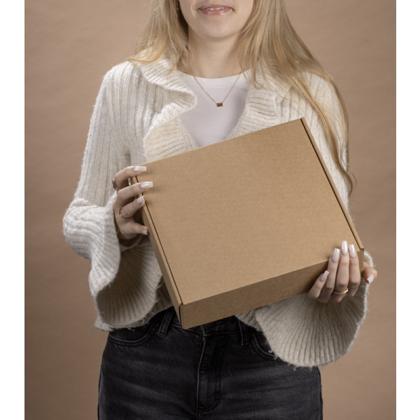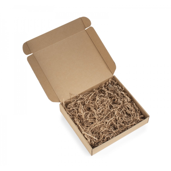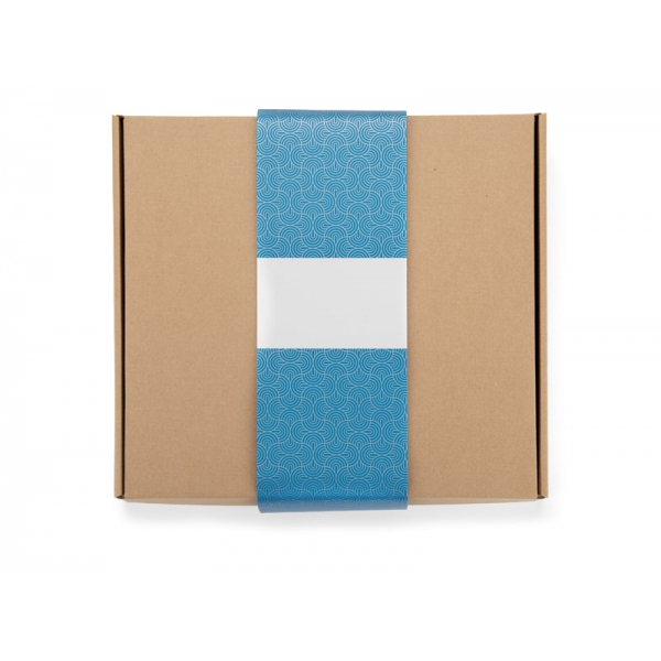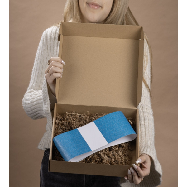 Zestaw do pakowania AZUL "S" to gotowe i estetyczne rozwiązanie do tworzenia firmowych upominków. W jego skład wchodzi solidne pudełko z tektury typu kraft, papierowy wypełniacz w dopasowanym beżowym kolorze (z atestem do kontaktu z żywnością) oraz niebieska owijka ze srebrnym, autorskim wzorem stworzonym dla BLUE COLLECTION. Owijka zapewnia eleganckie wykończenie i łatwe użytkowanie dzięki paskowi samoprzylepnemu. Zestaw występuje w trzech rozmiarach (S, M, L)– bez trudu dopasujesz je do planowanej zawartości.