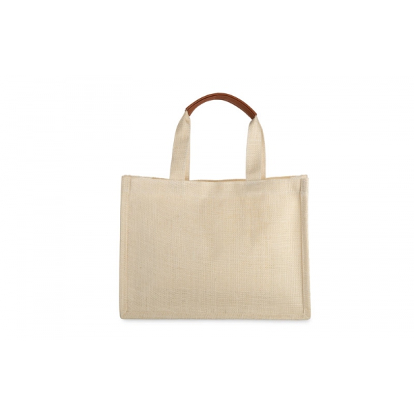 Torba jutowa JUNA to mniejsza wersja klasycznej torby plażowej – lekka, poręczna i idealna na letnie dni. Sprawdzi się jako mała torba na zakupy lub codzienna torebka o naturalnym charakterze. Wnętrze z podszewką i praktyczną kieszonką na zamek ułatwia organizację drobiazgów, a krótkie, płaskie uchwyty wzmocnione materiałem skóropodobnym (PU) zapewniają wygodne noszenie. Naturalna faktura juty i prosty nadruk nadają jej wakacyjnego stylu.