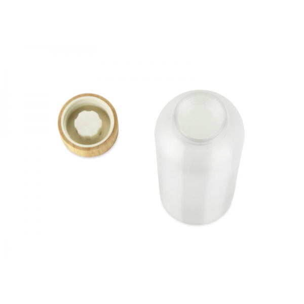 Butelka NILLO o pojemności 500 ml została wykonana z matowego szkła pochodzącego z recyklingu. Jej półprzezroczysta powierzchnia i bambusowa zakrętka nadają całości nowoczesny, stonowany wygląd. Klasyczna, gwintowana zakrętka zapewnia szczelne zamknięcie, a prosta forma sprawia, że butelka jest wygodna w codziennym użytkowaniu. Doskonale sprawdzi się do przechowywania wody, soków lub naparów. To elegancki gadżet wielokrotnego użytku z możliwością znakowania.