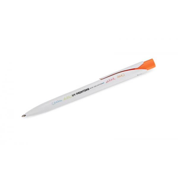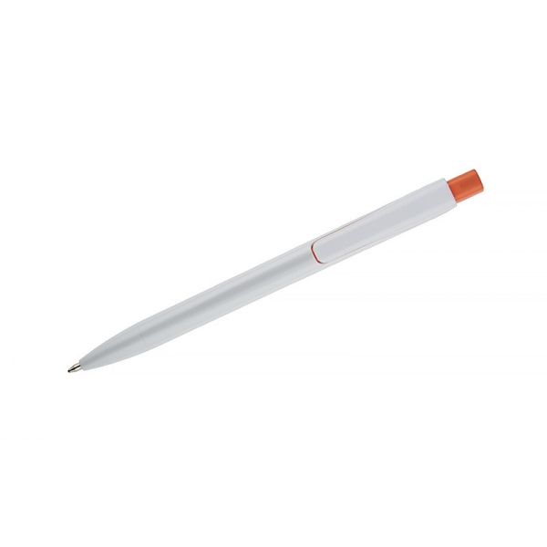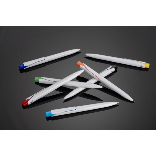 Długopis KLIBO wykonany jest z tworzywa rABS w klasycznym białym kolorze, z lakierowanym wykończeniem. Wyróżnia go kwadratowy, kolorowy przycisk oraz wąski, płaski klip, który pewnie trzyma się dokumentów i notesów. Mechanizm automatyczny zapewnia wygodne użytkowanie, a wkład typu G2 o grubości pisania 1,0 mm gwarantuje płynny i równy zapis. Lekka konstrukcja i nowoczesna forma sprawiają, że KLIBO to praktyczny gadżet reklamowy do codziennego użytku.