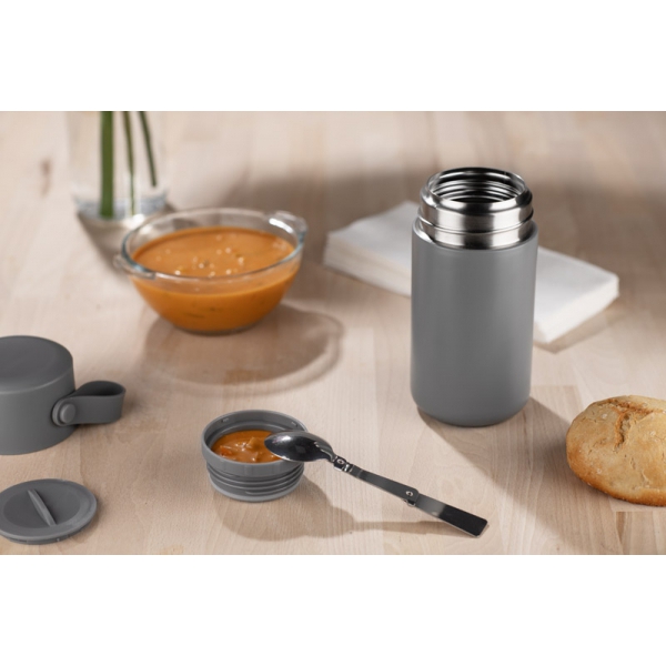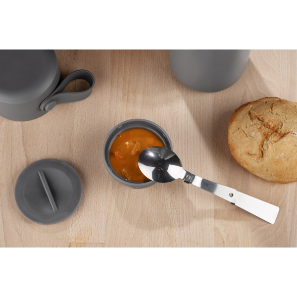 Pojemnik termiczny NOMIO 600 ml to funkcjonalne rozwiązanie do przenoszenia ciepłych posiłków. Wyposażony w szczelne, zakręcane wieczko i gumowy uchwyt, zapewnia wygodne użytkowanie w każdych warunkach. Wewnątrz znajduje się dodatkowy pojemnik z praktyczną, składaną łyżką — wszystko w jednym, kompaktowym zestawie. Dzięki właściwościom termicznym utrzymuje temperaturę jedzenia przez dłuższy czas, co czyni go idealnym towarzyszem w pracy, w podróży lub w terenie. Świetny wybór dla branży outdoor, eventowej i mobilnych zespołów sprzedażowych.