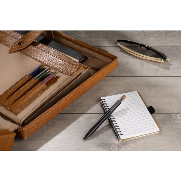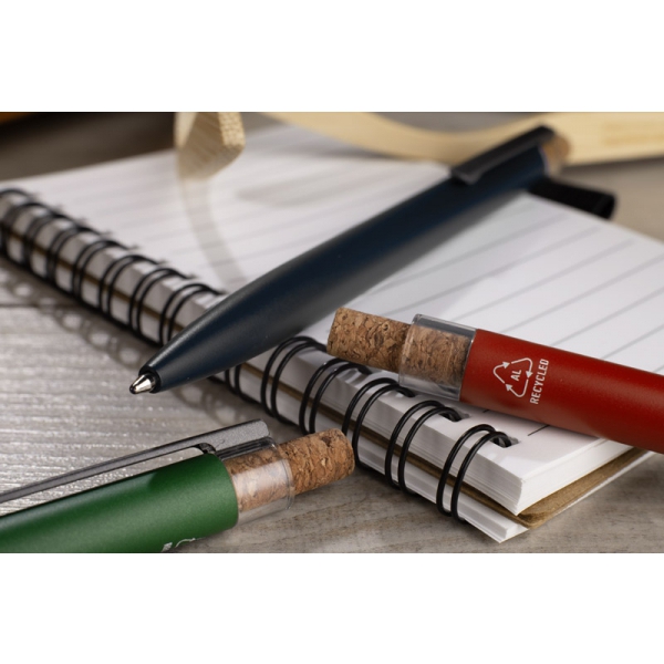 Długopis KORIN wykonany jest z recyklingowanego aluminium i pokryty lakierowanym wykończeniem, które nadaje mu gładką, satynową powierzchnię. Wyposażony w automatyczny mechanizm, wkład typu G2 o grubości pisania 1,0 mm oraz metalowy klips w kolorze grafitowym. Korkowy przycisk stanowi ciekawy akcent, podkreślający nowoczesny charakter długopisu. KORIN jest lekki, solidny i wygodny w codziennym użytkowaniu.