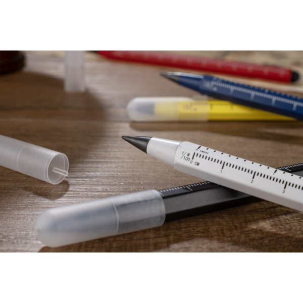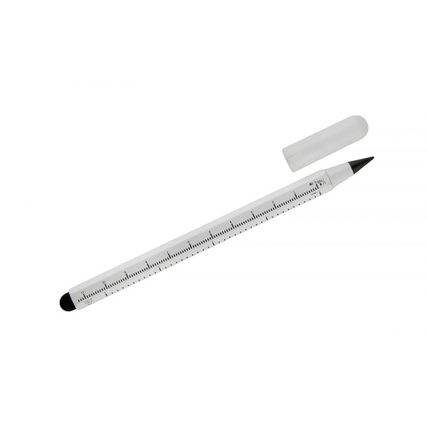 Ołówek wieczny DRAWI to praktyczny gadżet reklamowy wykonany z recyklingowanego aluminium z lakierowanym wykończeniem. Wyposażony w miarkę o długości 11 cm z podziałką w centymetrach i calach oraz touch pen, sprawdzi się w biurze, branży technicznej i budowlanej. Sześciokątny korpus zapewnia wygodny chwyt i zapobiega staczaniu się ołówka ze stołu. Zatyczka z tworzywa chroni końcówkę, co podnosi komfort użytkowania. Kompaktowy format sprawia, że DRAWI jest zawsze pod ręką i stanowi solidny nośnik reklamy dzięki możliwości znakowania.