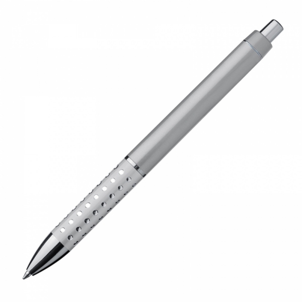 Plastikowy długopis o ozdobnym korpusie, z wkładem piszącym na niebiesko.