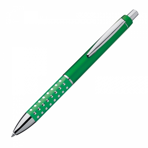 Plastikowy długopis o ozdobnym korpusie, z wkładem piszącym na niebiesko.