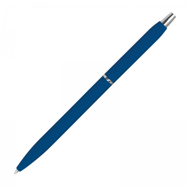 Smukły, gumowany długopis metalowy z wkładem piszącym na niebiesko.