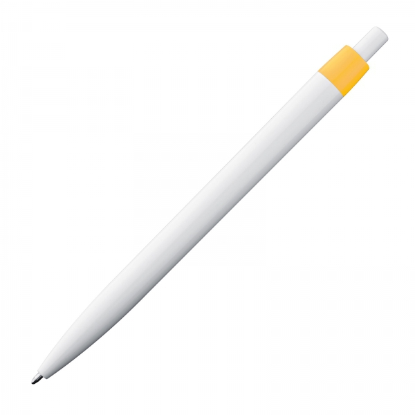 Plastikowy długopis z białym korpusem o klasycznym kształcie, wyposażony we wkład piszący na niebiesko.