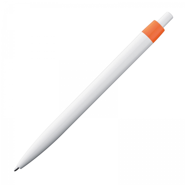 Plastikowy długopis z białym korpusem o klasycznym kształcie, wyposażony we wkład piszący na niebiesko.