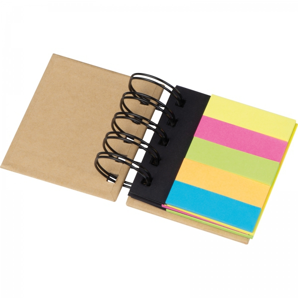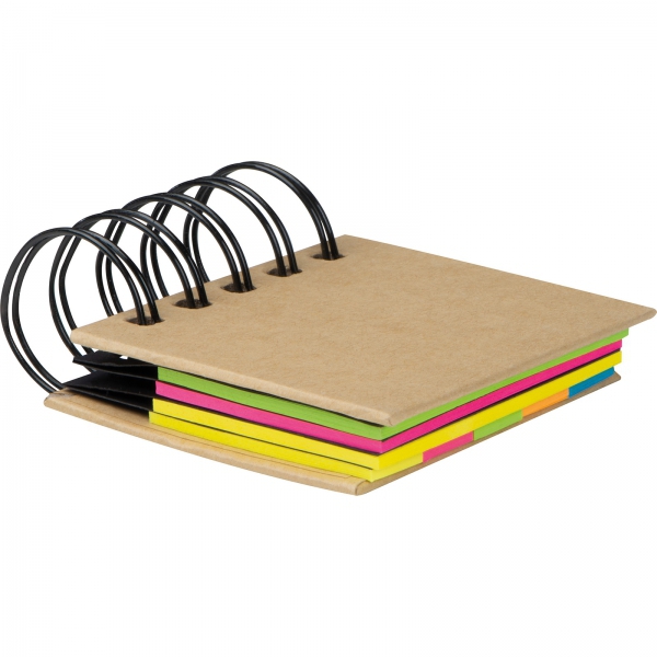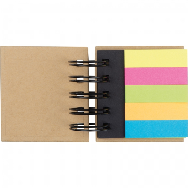 Zestaw karteczek w tekturowej okładce. Zawiera małe karteczki w 5 kolorach oraz 3 nieco większe bloczki (wszystkie samoprzylepne, po 25szt. w każdym kolorze).