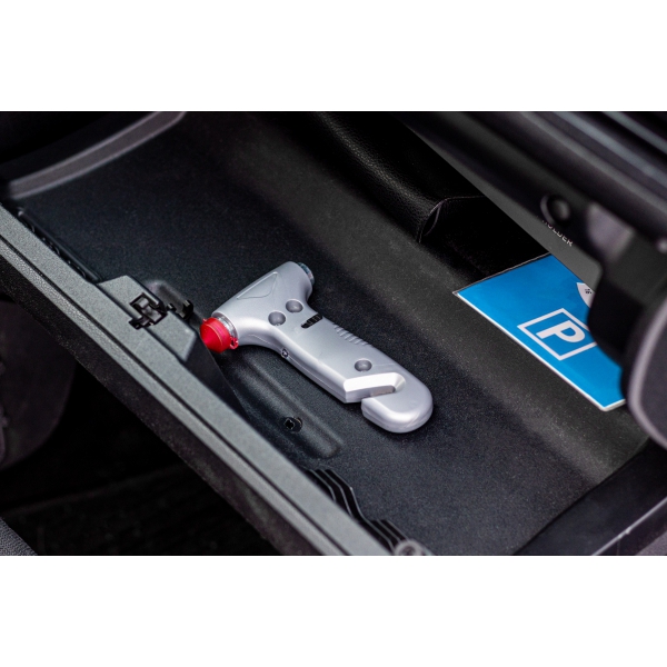 Młotek ewakuacyjny, do wybijania szyb. Dodatkowo wyposażony jest w lampkę LED i nóż do przecinania pasów.