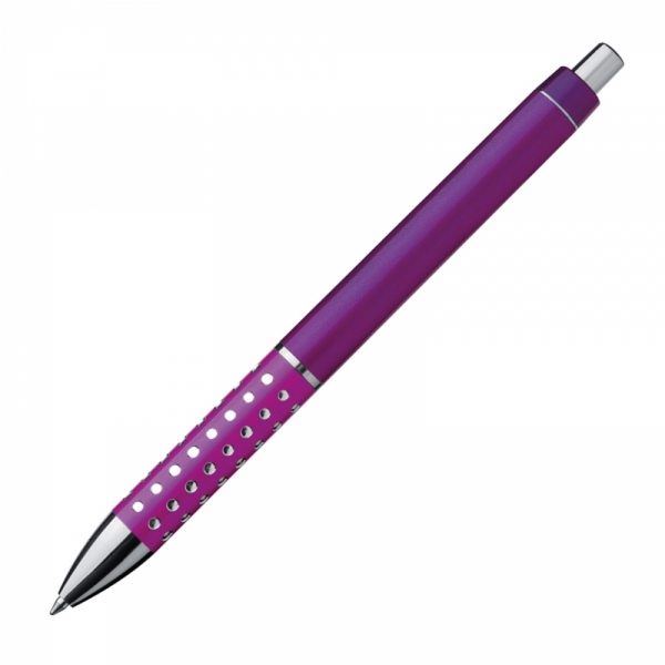 Plastikowy długopis o ozdobnym korpusie, z wkładem piszącym na niebiesko.