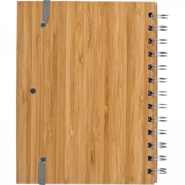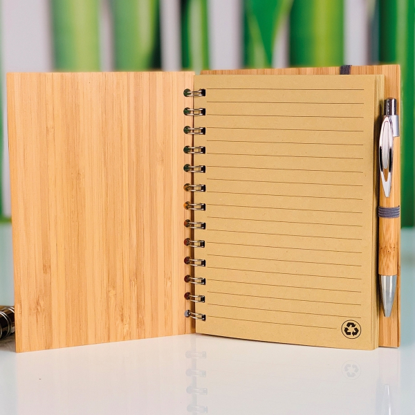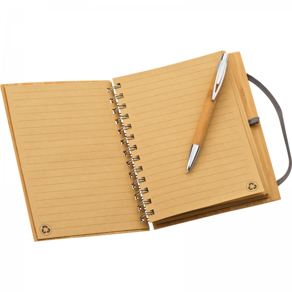Notes A5 w okładce z bambusa. Zawiera 140 stron z niebielonego papieru w linie pochodzącego z recyklingu, a także bambusowy długopis z niebieskim wkładem.