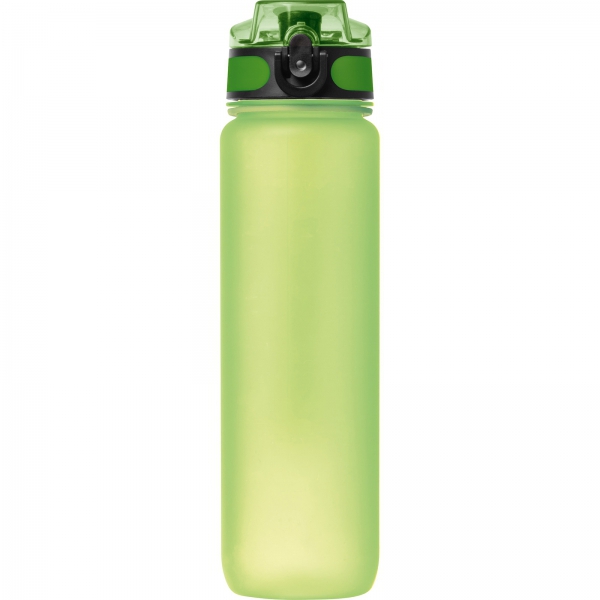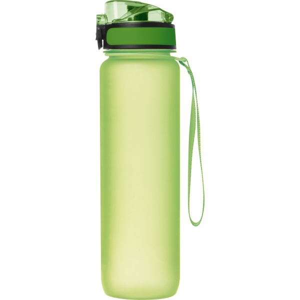 Szczelna, nie zawierająca BPA, sportowa butelka do picia wykonana z tritanu, z zamykaną pokrywką, paskiem na rękę. Pojemność 1000 ml.
