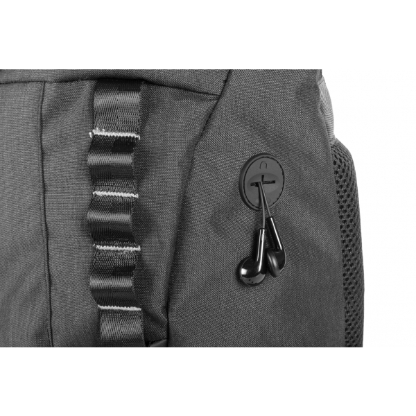 Plecak ze zwijanym zamknięciem, z watowanymi szelkami i plecami, wyposażony w dużą komorę główną z jedną oddzielną kieszenią i mniejszą kieszonką na akcesoria. Z przodu plecaka znajduje się mała kieszonka zamykana na zamek, po bokach dwie siatkowe kieszenie i jedna mała kieszonka z tyłu. Po zrolowaniu górnej części plecaka całość zamykamy dwoma paskami z plastikowymi klamerkami - tak zamknięty plecak będzie miał pojemność 25l. Plecak można również zamknąć bez rolowania, na zamek błyskawiczny - wtedy pomieści 32l.