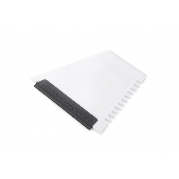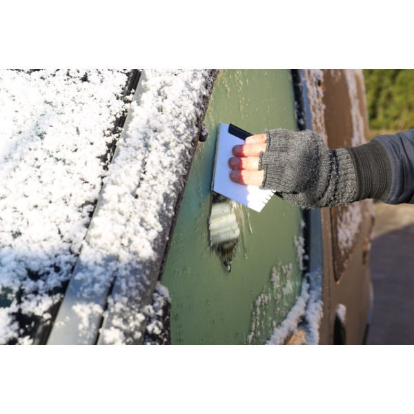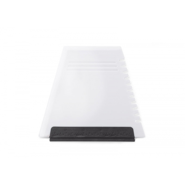 Skrobaczka do szyb z trzema końcówkami - płaską, ząbkowaną oraz gumową. Wykonana z tworzywa nietransparentnego.