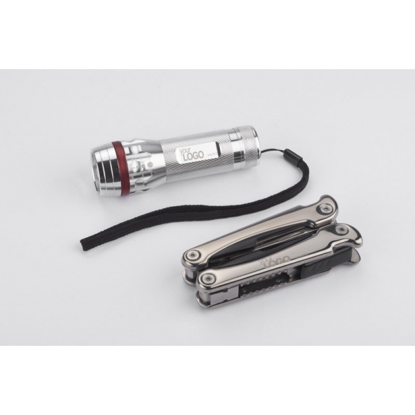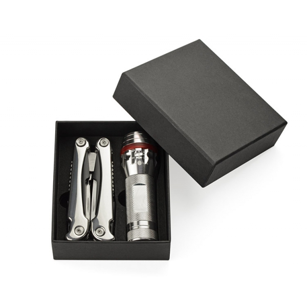 Zestaw upominkowy zawierający latarkę oraz narzędzie wielofunkcyjne. Latarka posiada bardzo jasną diodę, możliwość regulacji wiązki światła oraz 3 tryby świecenia: mocny, słaby oraz migający. Każdy element jest wykonany z metalu a całość zapakowana w eleganckie czarne pudełko.