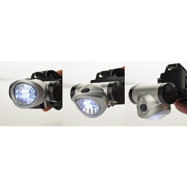 Praktyczna latarka czołowa wyposażona w 8 diod LED. Mocowanie na wytrzymałym i elastycznym pasku z regulacją długości. Posiada kilkustopniową regulację kąta nachylenia oraz 3 tryby świecenia: 2, 4 lub 8 diod. Latarka zasilana jest trzema bateriami AAA. Gadżet może być przydatny zarówno podczas turystycznych wędrówek jak i przy domowych pracach.