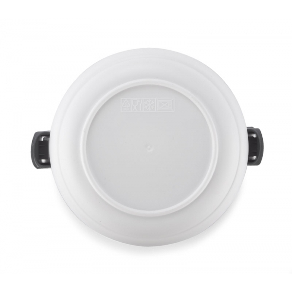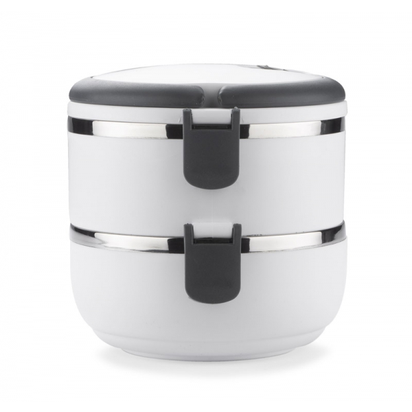 Pojemnik z wnętrzem ze stali nierdzewnej podzielony na dwie komory, które składamy jedną na drugą, co zapewnia poręczne i wygodne przenoszenie dwudaniowych posiłków. Górna komora wyposażona w uszczelkę. Uchwyty z tworzywa sztucznego z możliwością złożenia. Łączna pojemność: 1400 ml.