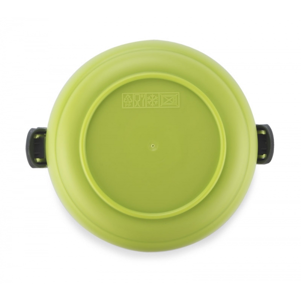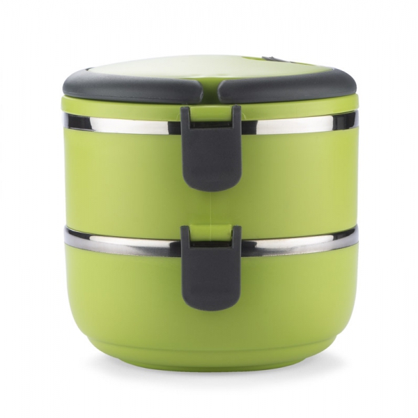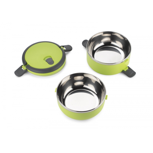 Pojemnik z wnętrzem ze stali nierdzewnej podzielony na dwie komory, które składamy jedną na drugą, co zapewnia poręczne i wygodne przenoszenie dwudaniowych posiłków. Górna komora wyposażona w uszczelkę. Uchwyty z tworzywa sztucznego z możliwością złożenia. Łączna pojemność: 1400 ml.